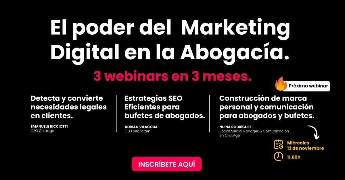 Tenemos a tu disposición un ciclo de seminarios web gratuitos específicos para abogados, bufetes y despachos, en el que profundizamos en publicidad, posicionamiento y marca personal. Puedes registrarte gratis aquí.